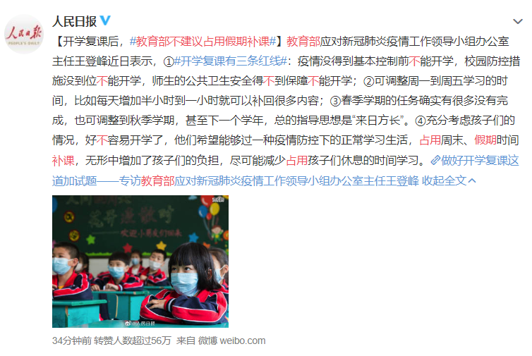 开学以后,我们还是鼓励各地充分利用周一到周五的有效教学时间。如果觉得这个学期的课程落下了一点,可以通过调整一下周一到周五学习的时间,比如每天增加半小时到一小时,就可以补回很多内容。