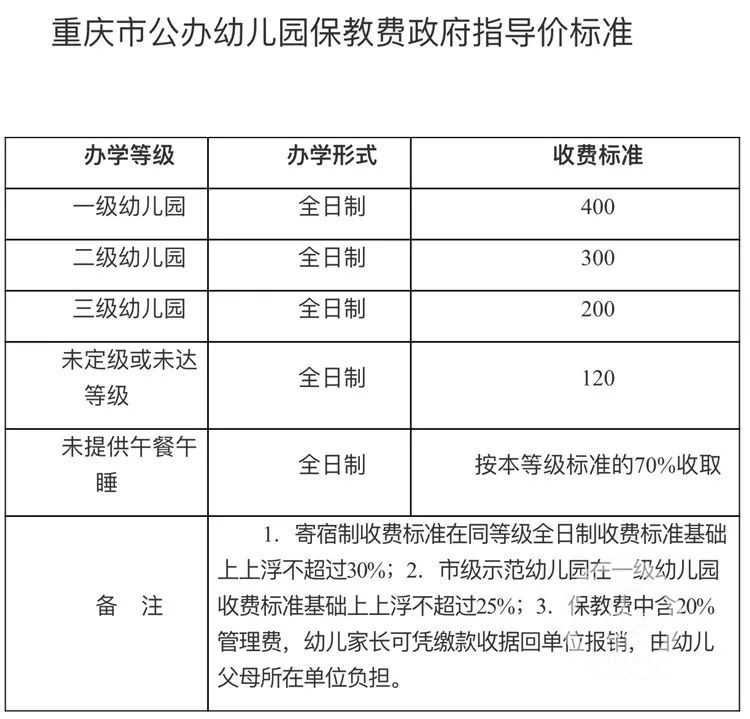 为进一步加强重庆市幼儿园收费管理,规范收费行为,近日,重庆市教委发布了《关于进一步规范我市幼儿园收费行为的通知》(以下简称《通知》),公布了重庆市幼儿园的收费项目、收费标准等相关内容。《通知》明确,幼儿园不得跨学期预收保教费,不得在保教费外以开办兴趣班等为名向家长另行收取任何费用。