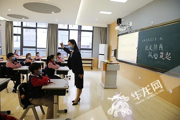 重庆两江新区星湖学校开学第一课,老师教学生防疫知识。华龙网-新重庆客户端 记者 李文科 摄