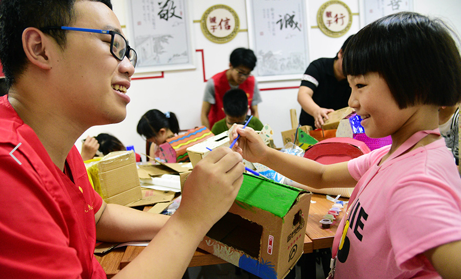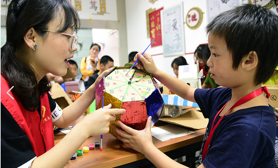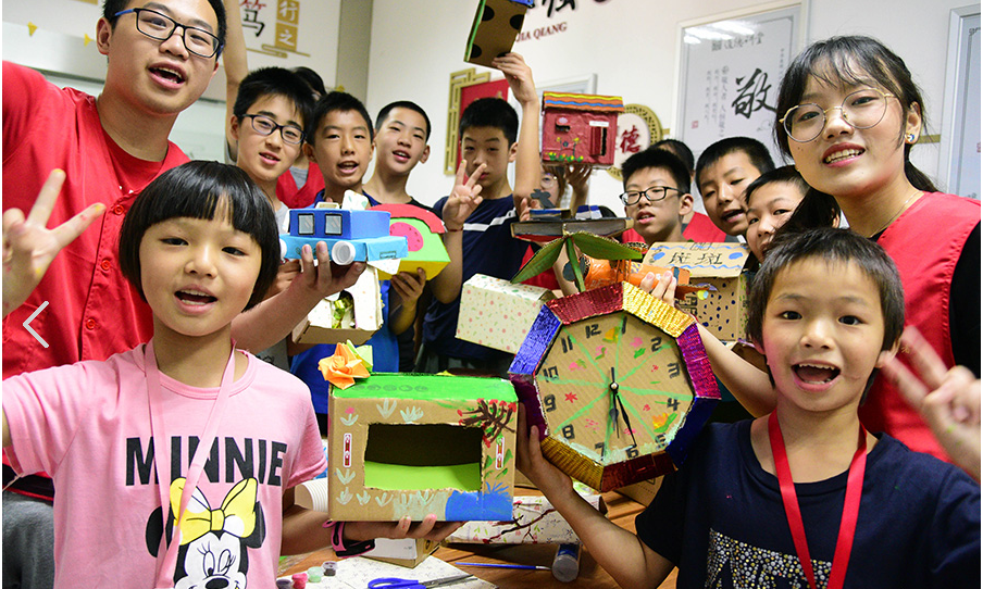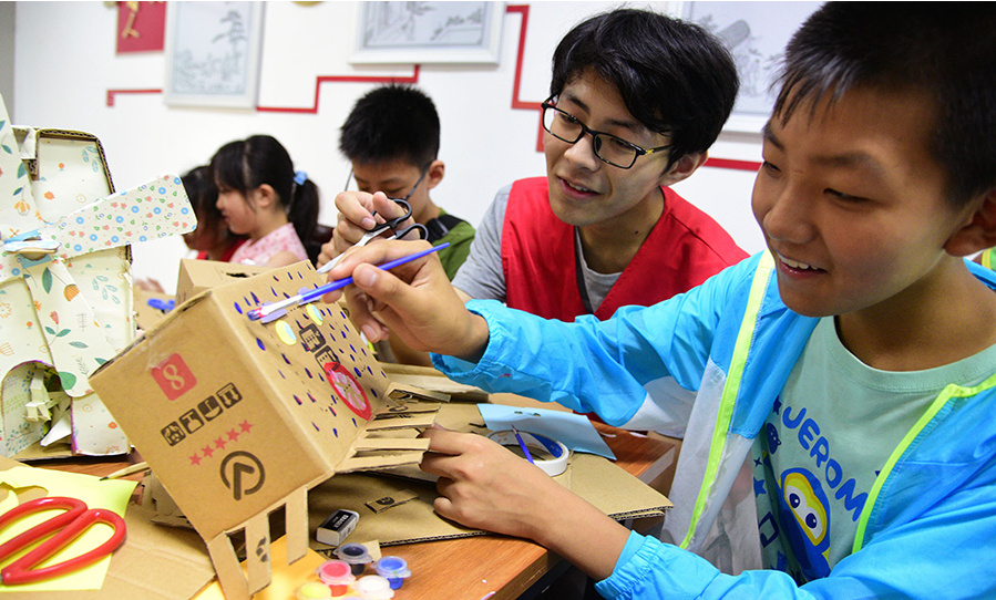 【2019第三届上海国际未来教育展览会】 江苏大学志愿者在指导小朋友用废旧快递盒制作工艺品。正值暑假,江苏大学的志愿者走进镇江市宝塔路街道金桥社区,开展“快递盒‘变废为宝’倡环保”活动,指导小朋友们用收集的快递盒制作钟表、汽车模型等创意环保工艺品。孩子们在活动中增强了动手能力,培养了节约资源的环保意识,丰富了假期生活。(石玉成 周存君/摄)